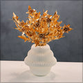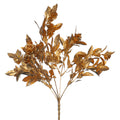 A metallic gold-colored decorative branch featuring detailed leaves and blooms. The arrangement showcases intricately crafted flowers and foliage, all coated in a shiny gold finish, giving it an elegant and luxurious appearance. Perfect for festive or ornamental decor, it adds a touch of sophistication and glamour to any setting.