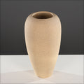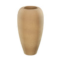 A tall, elegant vase with a smooth, elongated oval shape. The vase has a narrow base that gradually widens toward the middle before tapering to a smaller opening at the top. It features a light brown or beige color with fine horizontal ridges, giving it a subtle textured appearance. The design is minimalist and natural, suitable for modern, rustic, or earthy interior décor styles.