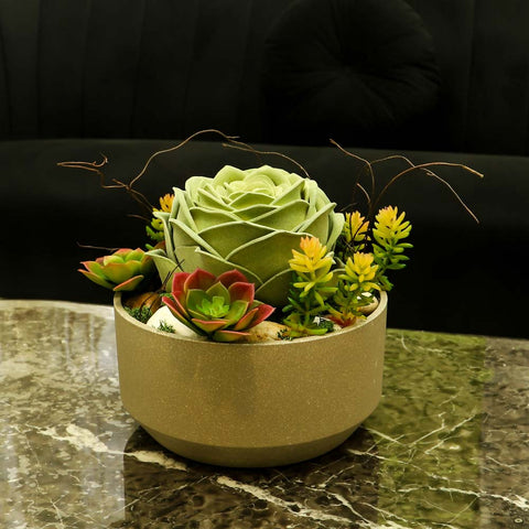 - The artificial green succulent pot is designed to seamlessly fit into various spaces, whether it’s your desk, coffee table, or kitchen countertop.